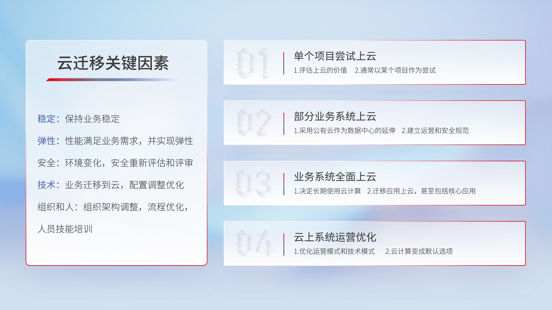 结合实际业务,,从规划设计、、、云平台选型、、、云原生改造、、数据迁移、、集成交付,,,,迁移全过程为客户识别最佳上云路径,,,,做好风险识别管理,,,,设计网络架构、、、、身份权限、、安全审计合规、、、、操作审计、、日志审计、、、监控告警策略、、多站点容灾设计等,,对云上基础设施进行整体规划,,,提升IT治理水平,,,以满足弹性、、、高可用、、、高性能的需求。。